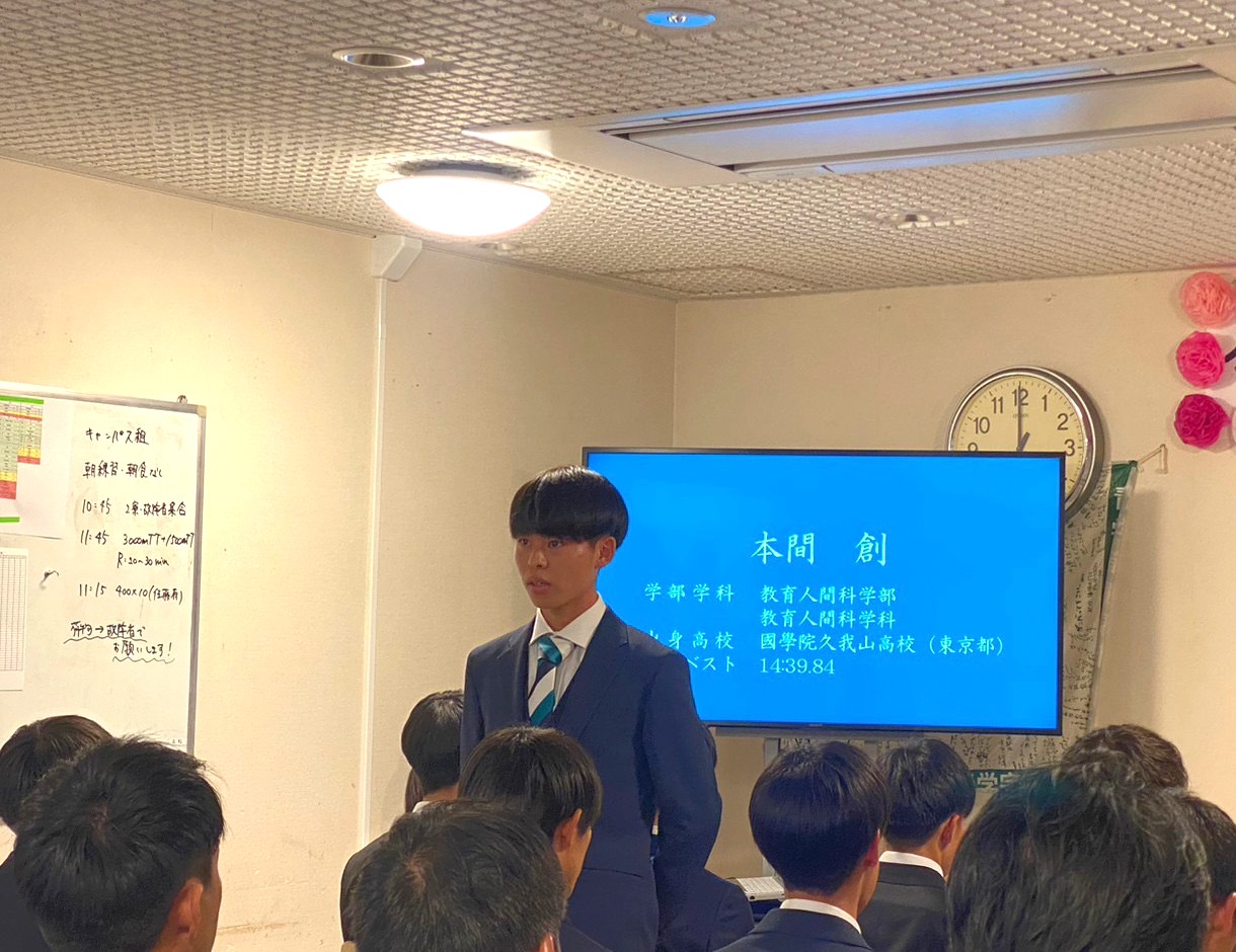 本間 創(ほんま そう) 出身:國學院久我山高校(東京都) 僕は東京出身の選手で地方から来たわけではないのですが、寮生活というのが初めてでまだ慣れない部分も多いですが、 1年目から活躍したい、箱根駅伝や出雲駅伝で活躍したいという思いが強いので、4年間通してどんどん強くなっていきたいです。 1年目から先輩たちに食らいつき、追い越していくのを目標に頑張っていきます。 |